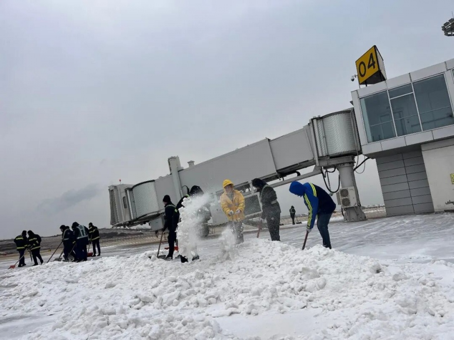 为有效应对降雪天气,机场制定了《道面结冰防范专项方案》,并开展桌面演练,重点梳理除冰雪期间通信、车辆故障、车辆队形等方面可能出现的问题及控制措施。密切关注天气变化,及时启动除冰雪应急预案,每两小时开展一次现场雪情观测与道面状况评估,累计出动热吹车8台次、三合一除雪车1台次、平铲装载机1台次,航站区道路撒布融雪盐0.5吨、防滑沙2立方,出动除冰雪人员100余人次,确保道面适航。