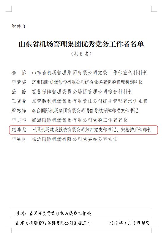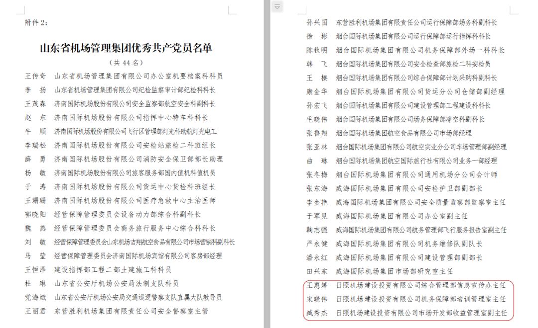 在本次表彰中,日照机场第二党支部荣获“山东省机场管理集团先进基层党支部”荣誉称号;第四党支部书记赵沛龙被授予“山东省机场管理集团优秀党务工作者”荣誉称号;综合管理部王惠婷、机务保障部宋晓伟、市场开发部臧秀杰等3名同志被授予“山东省机场管理集团优秀共产党员”荣誉称号。