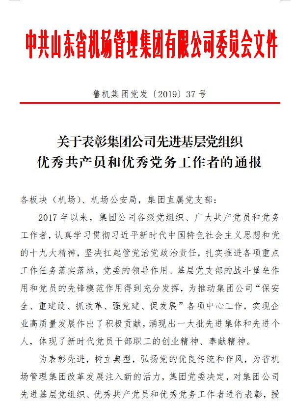 为深入学习贯彻习近平新时代中国特色社会主义思想,表彰先进,树立典型,弘扬党的优良传统和作风,为省机场管理集团改革发展注入活力,近日,省机场管理集团党委命名表彰一批先进基层党组织、优秀共产党员和优秀党务工作者。