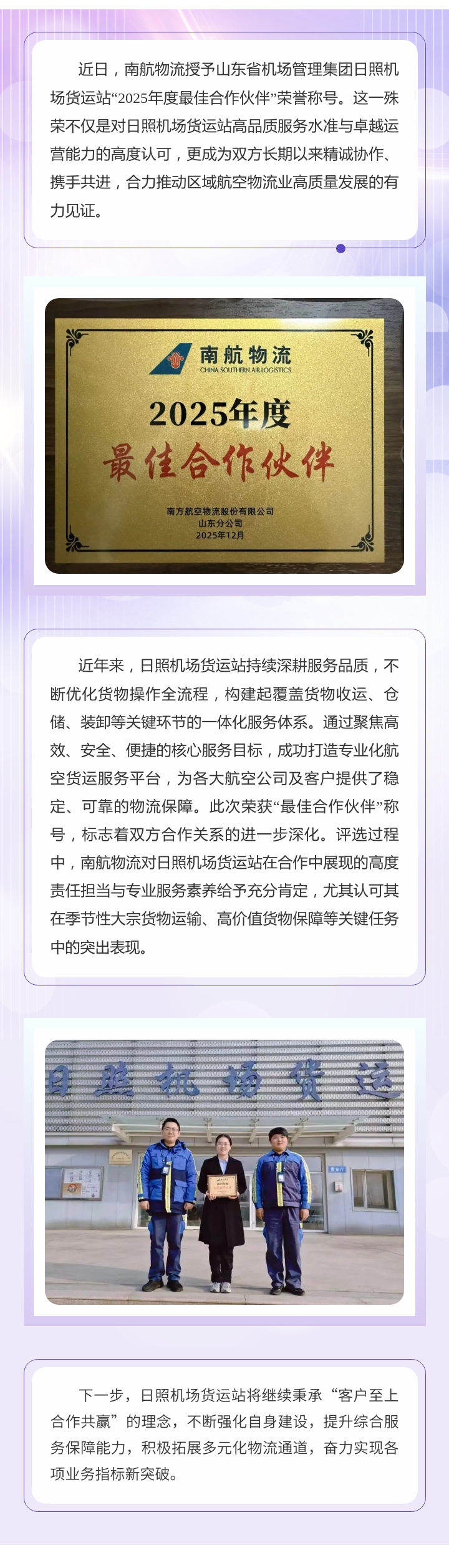 山东省机场管理集团日照机场货运站荣获南航物流“最佳合作伙伴”称号