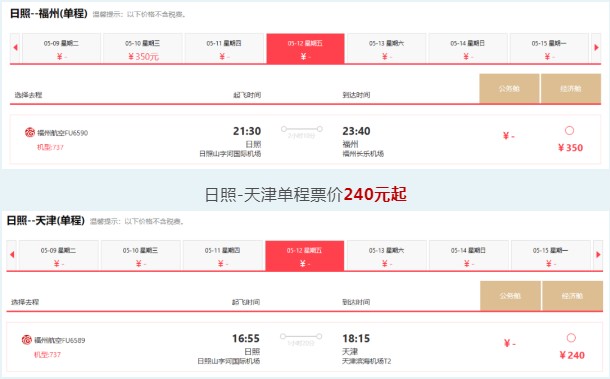 日照-福州单程票价350元起